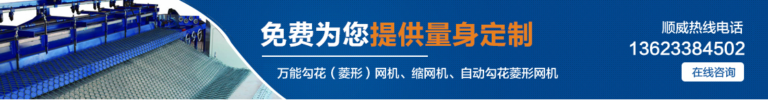 | 安平縣順威絲網機械設備制造有限公司自產自銷,省去中間環節,讓利給客戶,真正的讓您省錢。主要產品有:萬能勾花(菱形)網機、縮網機、自動勾花菱形網機、全自動勾花菱形網機。 |